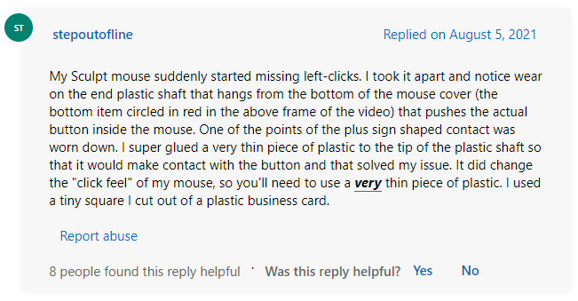 그래서 다음으로 의심한 사항은 스위치를 누르는 막대 부분의 마모 현상이었습니다. 이 현상은 마이크로소프트 커뮤니티에도 게시되어 있고 실제로 추천도 많이 받은 상태라 가장 유력한 용의자라고 생각되었습니다.