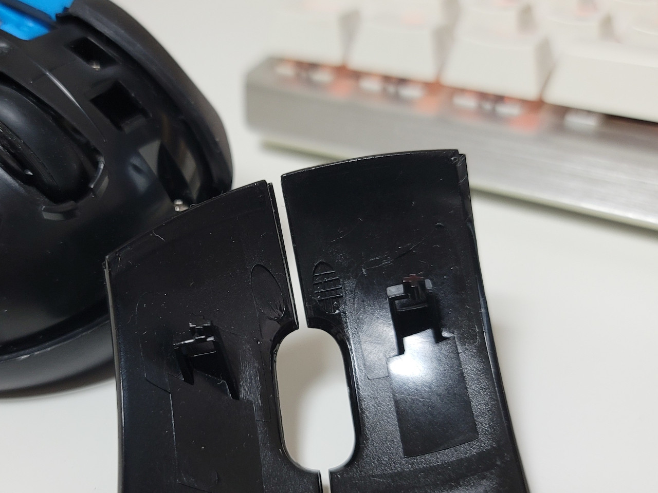 일단 소프트웨어적인 설정으로는 클릭 미스 현상이 해결되지 않아서 몇 가지 의심되는 사항을 점검하기 위해 분해를 시작했습니다. 우선 전원을 끄고 배터리를 분리했는데요, 이 마우스는 바닥 커버가 자석으로 되어 있어서 탈부착이 편리한 점이 마음에 드네요.